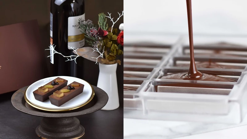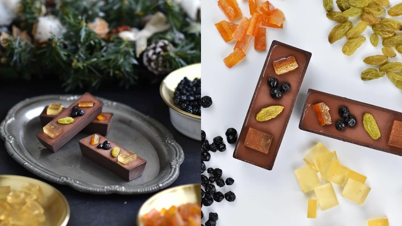 而在「風味生巧塔-日曬」上,還加上蜂蜜檸檬法式軟糖、青提子、野生小藍莓,以及糖漬橘條等四種食材點綴,長條精緻外觀如同珠寶盒,主廚建議由檸檬軟糖吃起,接著是青提子與野生小藍莓,最後以強烈的柑橘香氣做結尾,每一口都能嚐到不同的巧克力風味。
