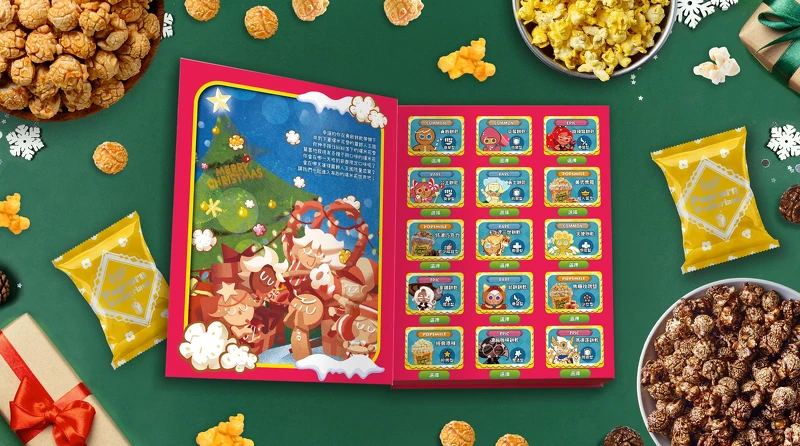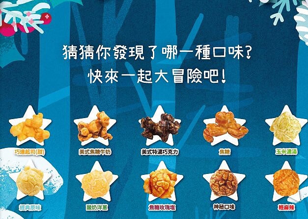 15格戳戳樂涵蓋了豐富的遊戲元素,內含巧達起司(甜)、美式焦糖牛奶、美式特濃巧克力、焦糖、玉米濃湯、經典原味、酸奶洋蔥、焦糖玫瑰鹽、輕麻辣,多樣人氣口味隨機放入,此外還有神秘版聖誕節限定口味爆米花,看看誰是聖誕獨享幸運兒!