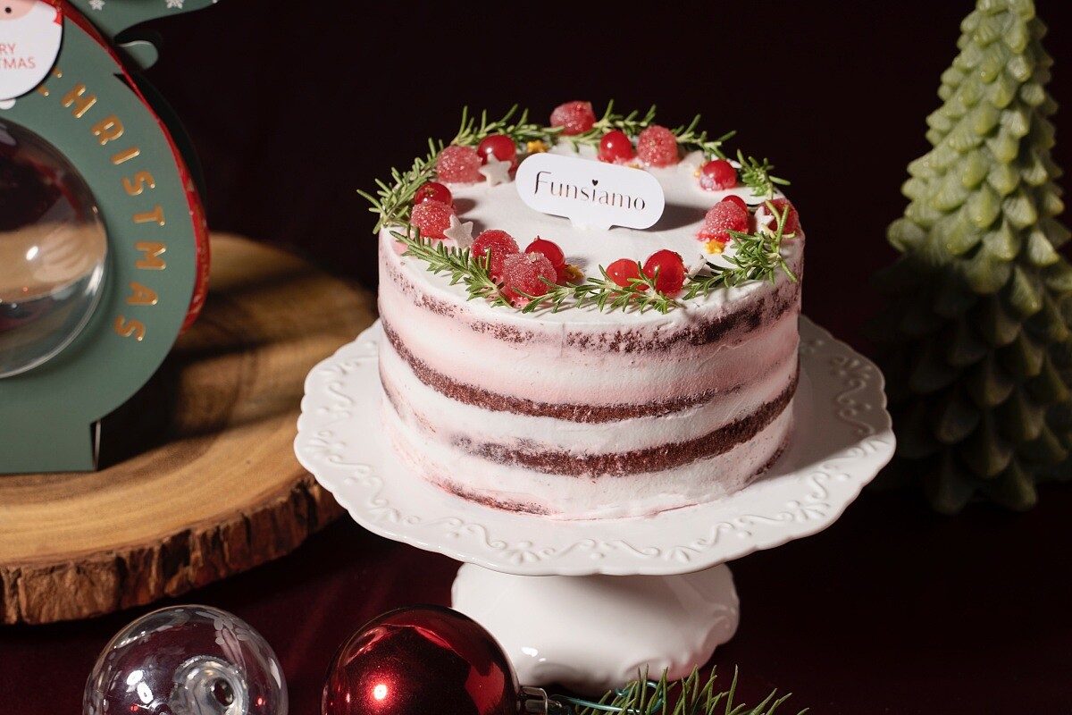 可以吃的聖誕花圈!以紅絲絨蛋糕為基底,夾心則使用酸甜藍莓果餡,再還加入清爽滑嫩的手作奶酪,蛋糕最上從則使用紅醋栗、迷迭香錯落堆疊,打造成聖誕花圈造型。