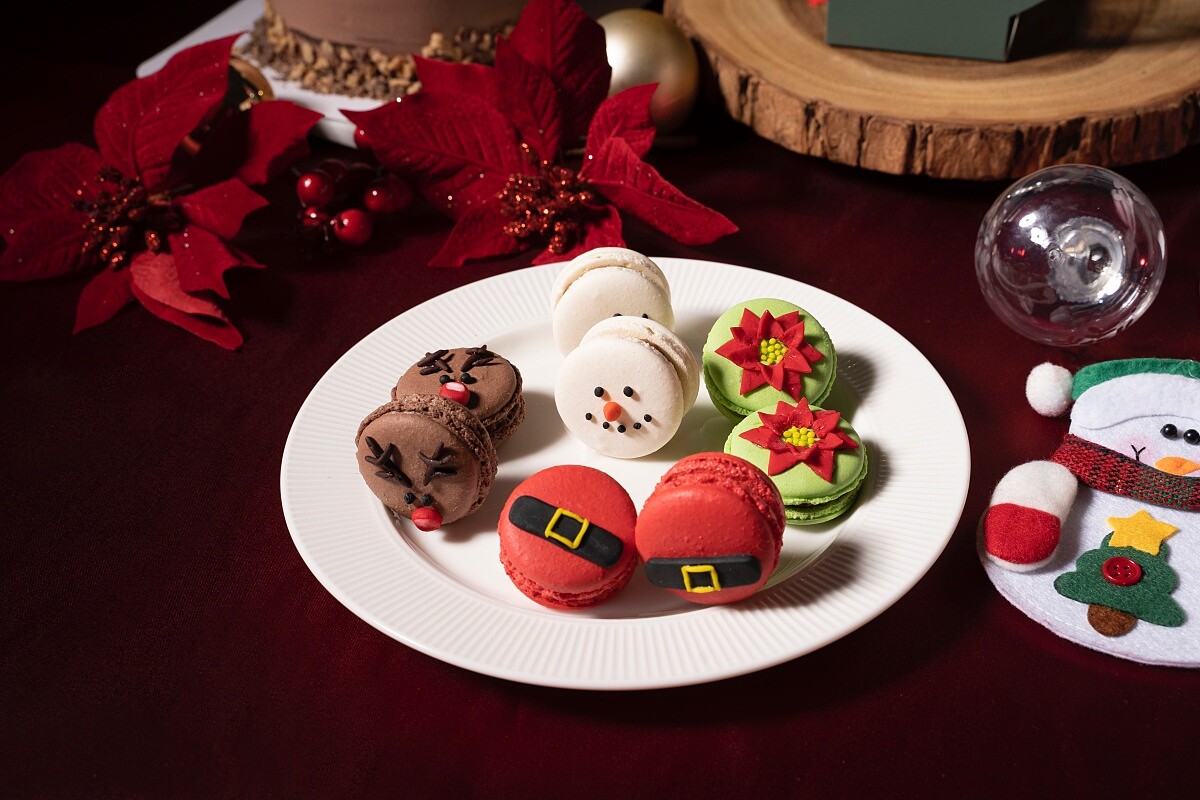 這款非常適合親子同樂!使用瑞士蛋白霜製成四色馬卡龍,再以翻糖製作聖誕老公公的腰帶、雪人和麋鹿的鼻子與眼睛,以及燦爛綻放的聖誕紅,內層夾餡則使用KitKat巧克力脆片抹醬,口感層次豐富。