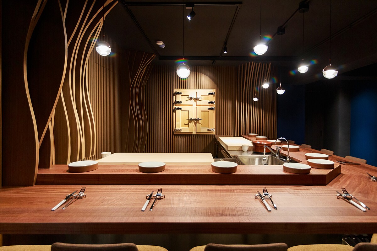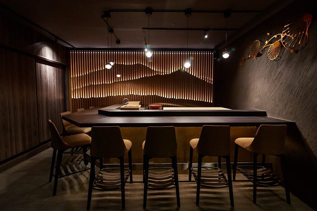 最裡頭可坐8人的獨立包廂,則精心以荷葉造型金工,呼應店名,同時在光影變化中,還隱約可見料理檯後方京都最著名的三座山景「比叡山、鞍馬山、愛宕山」錯落有置的動人雕飾。