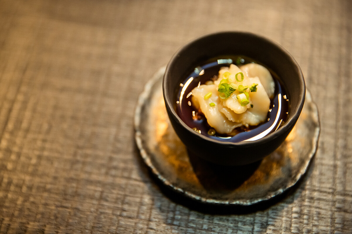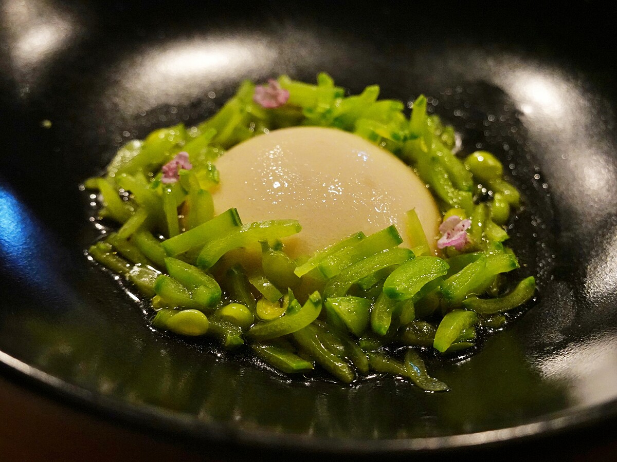 主廚 Terry 手工自製的綿密豆腐,搭配甜豆莢、毛豆仁,蘸佐以柴魚高湯、米醋特製的煙燻柚子醋醬油,每一口都是甘醇的醍醐味。