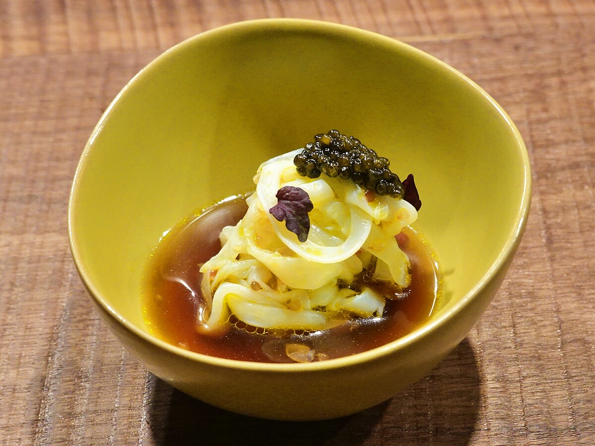 用台灣烤魷魚熬煮的高湯,搭配特級魚子醬、紫蘇油、指橙,既香又甜的珍饈。