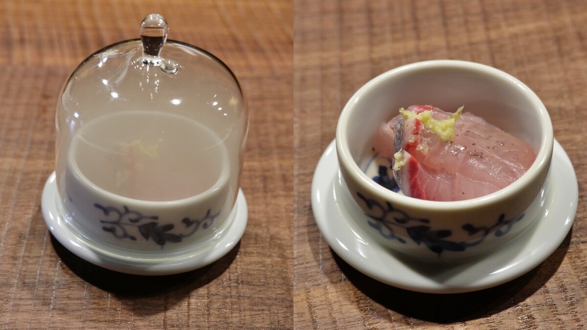 Terry 主廚精選當日食材,以精湛刀工切下熟成後的鹿兒島間八刺身,再以櫻木花冷燻上桌,搭佐靜岡縣產山葵芥末,色香味俱全的軟嫩彈牙。