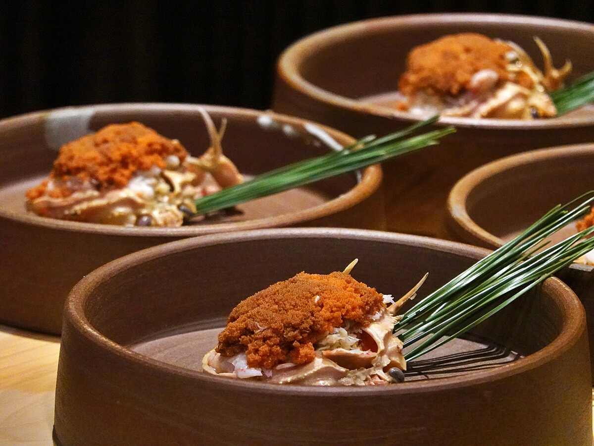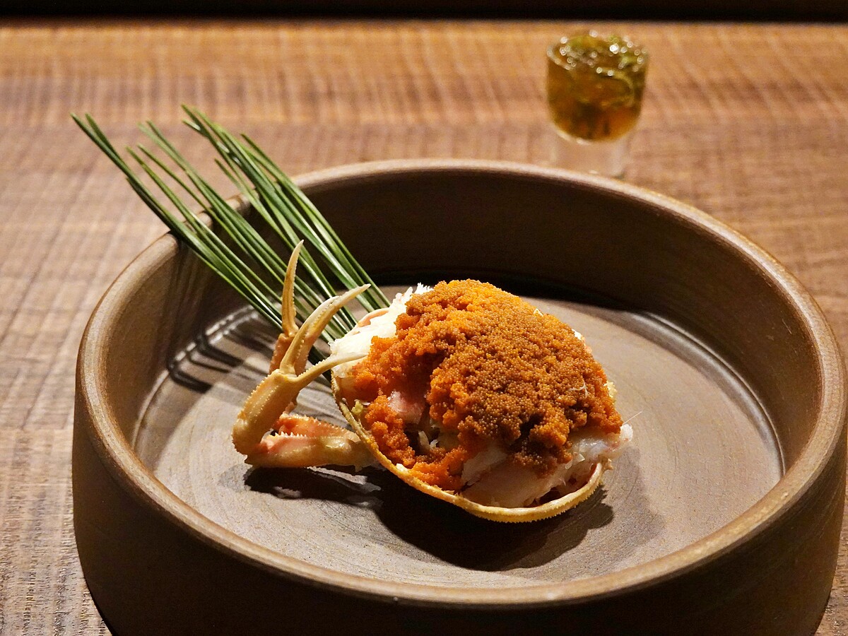 Terry 主廚選用產自北海道香香蟹,為抱卵母松葉蟹,能一次品嘗到蟹肉、蟹膏與蟹卵三種風味口感;不論是原始的鮮味,或是再淋上主廚特製的酸味醬,怎麼吃都鮮甜無比,一感上乘豐厚的美味。