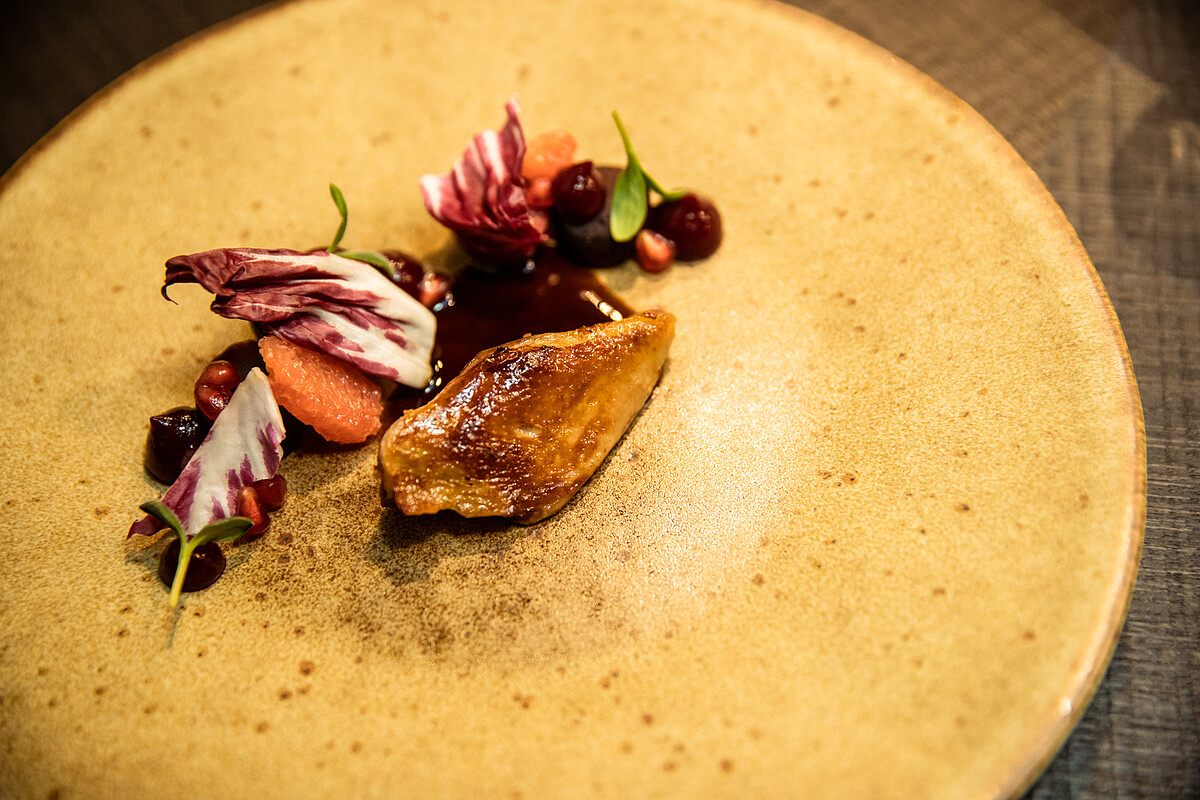 主廚特選台灣屏東乳鴿,製成兩道料理。先是每天在乳鴿上刷日本米麴,風乾10~20天熟成後,取胸肉部位烘烤,搭配上甜菜根、番石榴、柚子和葡萄柚等蔬果沙拉,以酸甜提味乳鴿的野性,讓整體風味更多層次。