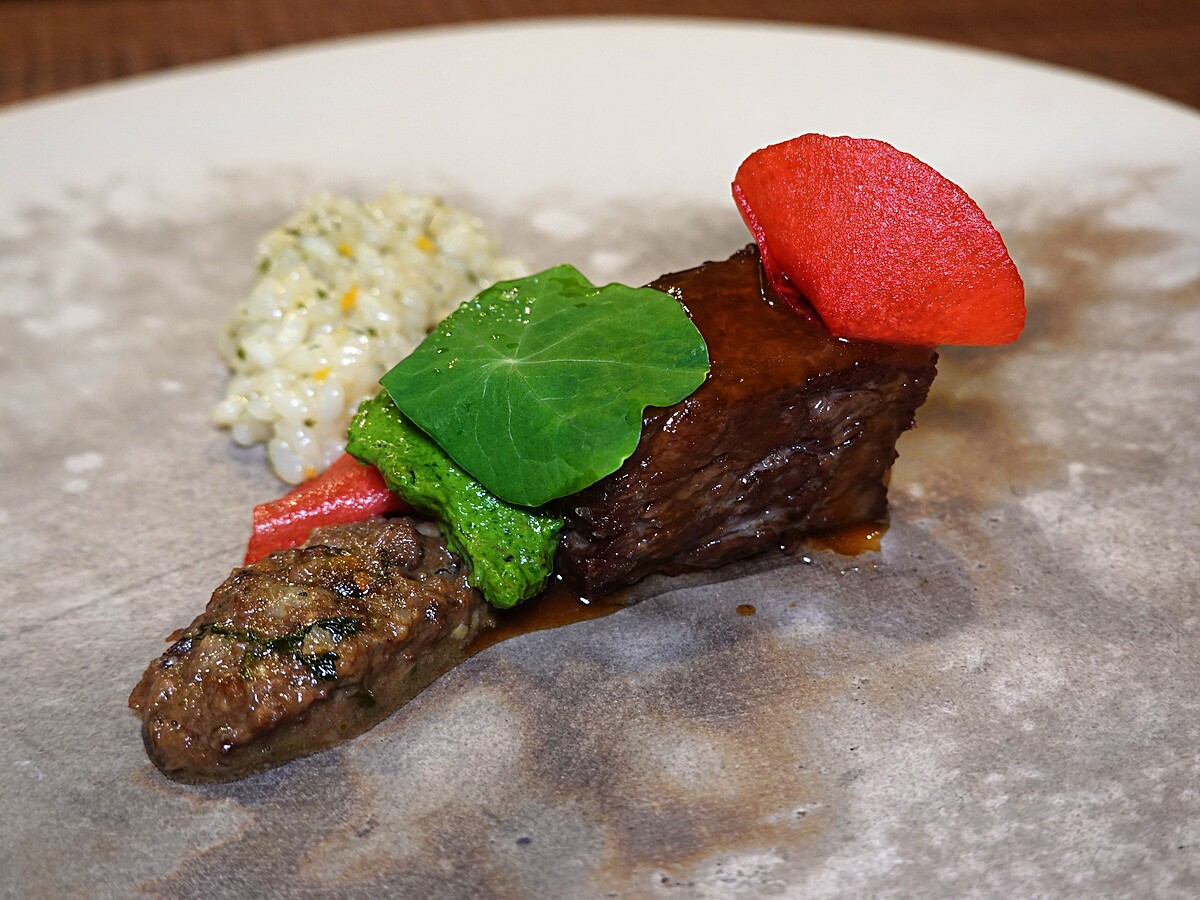 精選口感絕佳的台灣台梗九號米,以陳皮、龍蒿、帶帶橙調味後製成燉飯,帶有淡淡果香,與風味濃郁的澳洲熟成和牛短肋與燉牛尾一起享用,層次豐富的齒頰留香。