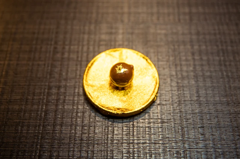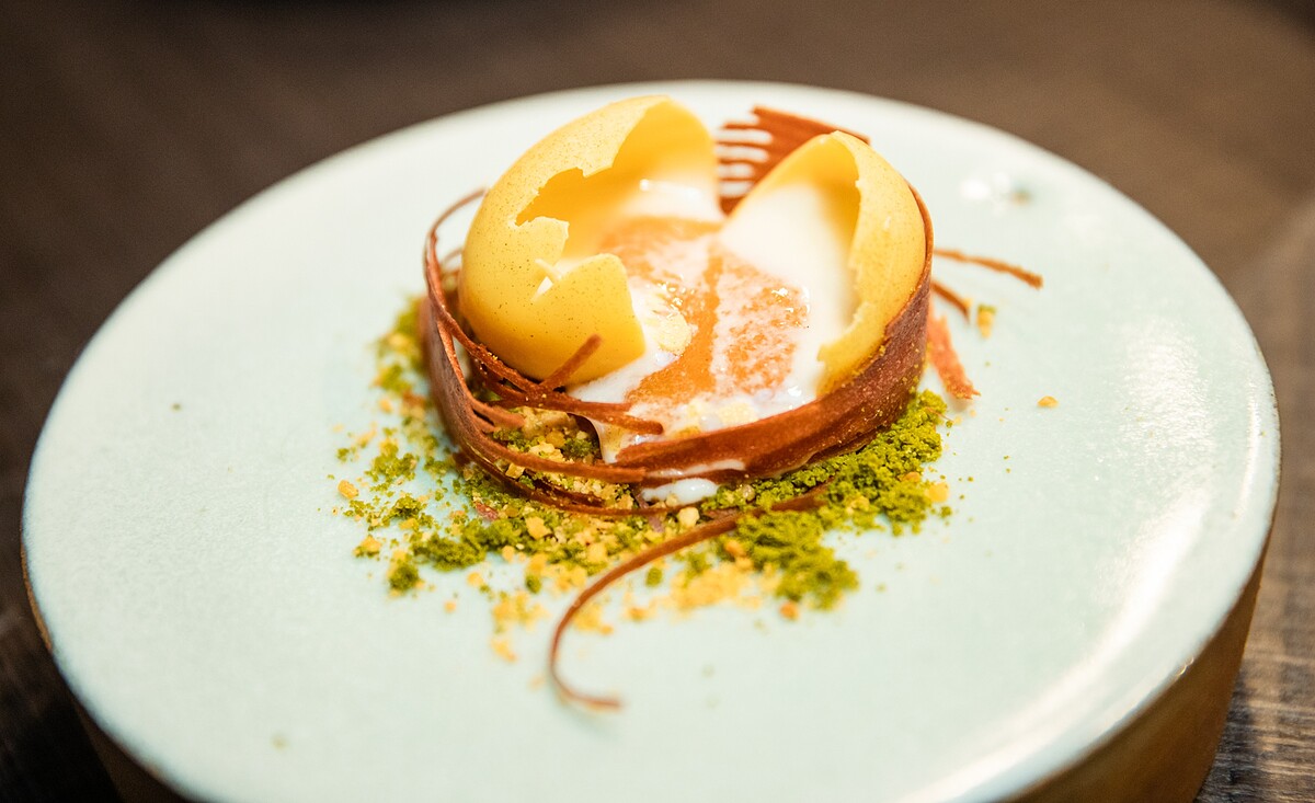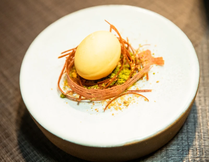 精彩的 Kaiseki 套餐有三款甜點,第一道為造型獨特又童趣的黃金蛋,Patrick 主廚使用白巧克力和可可奶油為蛋殼,以及周邊也可供食用的杏仁巢、綠地等元素風味食材。