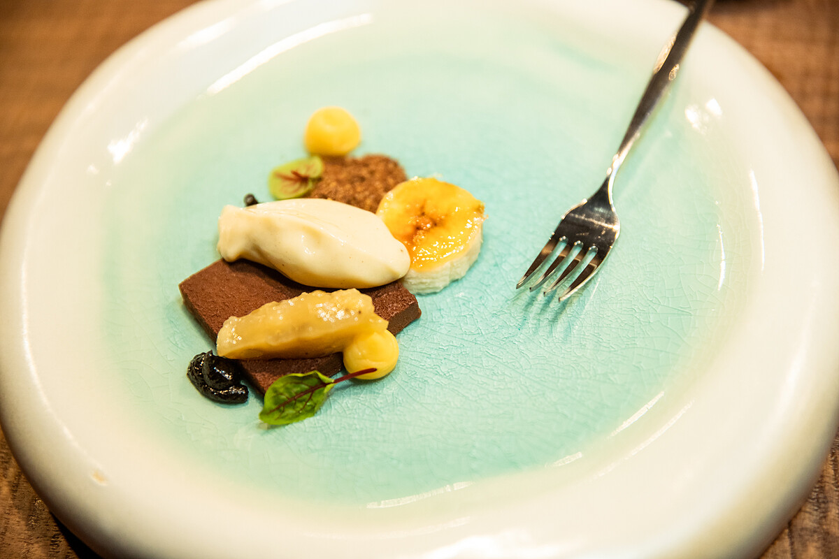 爽口解膩的柚子酪佐上70%瓜那加巧克力、烤焦糖香蕉與黑芝麻醬、柚子醬,是 Patrick 主廚別出心裁的甜點組合。最後再以一道甜鹹風格的手工味噌糖果子,搭配廣方圓手工易武山古樹白茶,為套餐劃上完美飽足的句點。