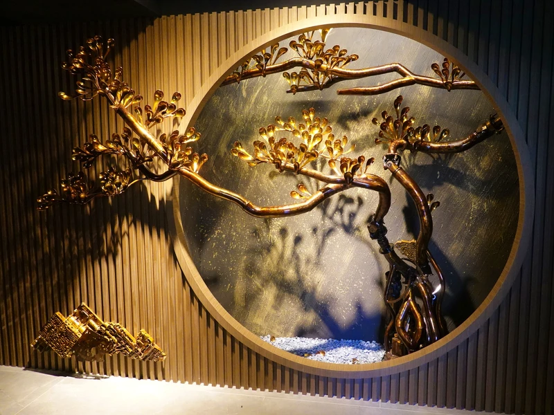 沿著blu koi簡約俐落的日式黑灰石材融合松樹庭園石階路入內,映入眼廉的是由台灣藝術家特別以銅製湯匙和排氣管等創意打造的「迎客松」金工藝術,令人仿如置身在日式摩登氣息中。