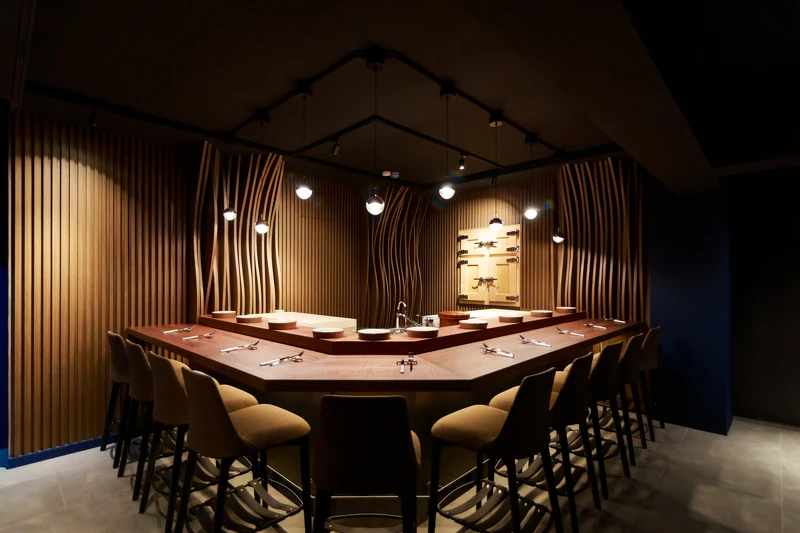 blu koi內部以京都金閣寺為意象概念打造的空間設計,規劃有兩個用餐區,第一間10人座位區,以木質俐落刻畫出「流水」感的線條造型設計,在板前空間更設置了專門從日本訂製的不插電 Himuro「冰室」,以這座在高級日料餐廳才會有的頂級設備,藉此保存、熟成新鮮的魚貨。