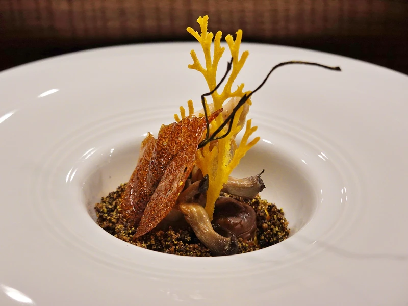 一樣有濃厚秋冬食感的野味森林,以發酵過的南瓜為基底,再舖上由牛肝菌、甜菜根和開心果、moro味增混製幻化做森林土壤,陳設上主廚巧手將舞茸、板栗、kabocha 南瓜等食材變身成的枝木、葉片等森林景象,創作溫暖豐盈的視覺和味覺雙重享受,盡享層層美妙的幸福滋味。