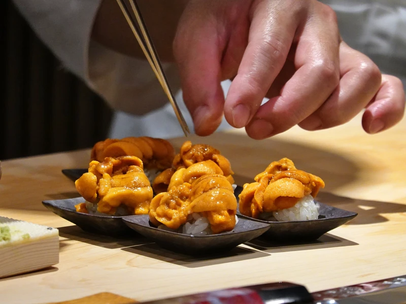 炙燒過的日本富山冰見寒獅魚、手捏的鮪魚大脂握壽司、烏賊握壽司、海膽握壽司,嘗得到冬日最肥美的高級肉質。