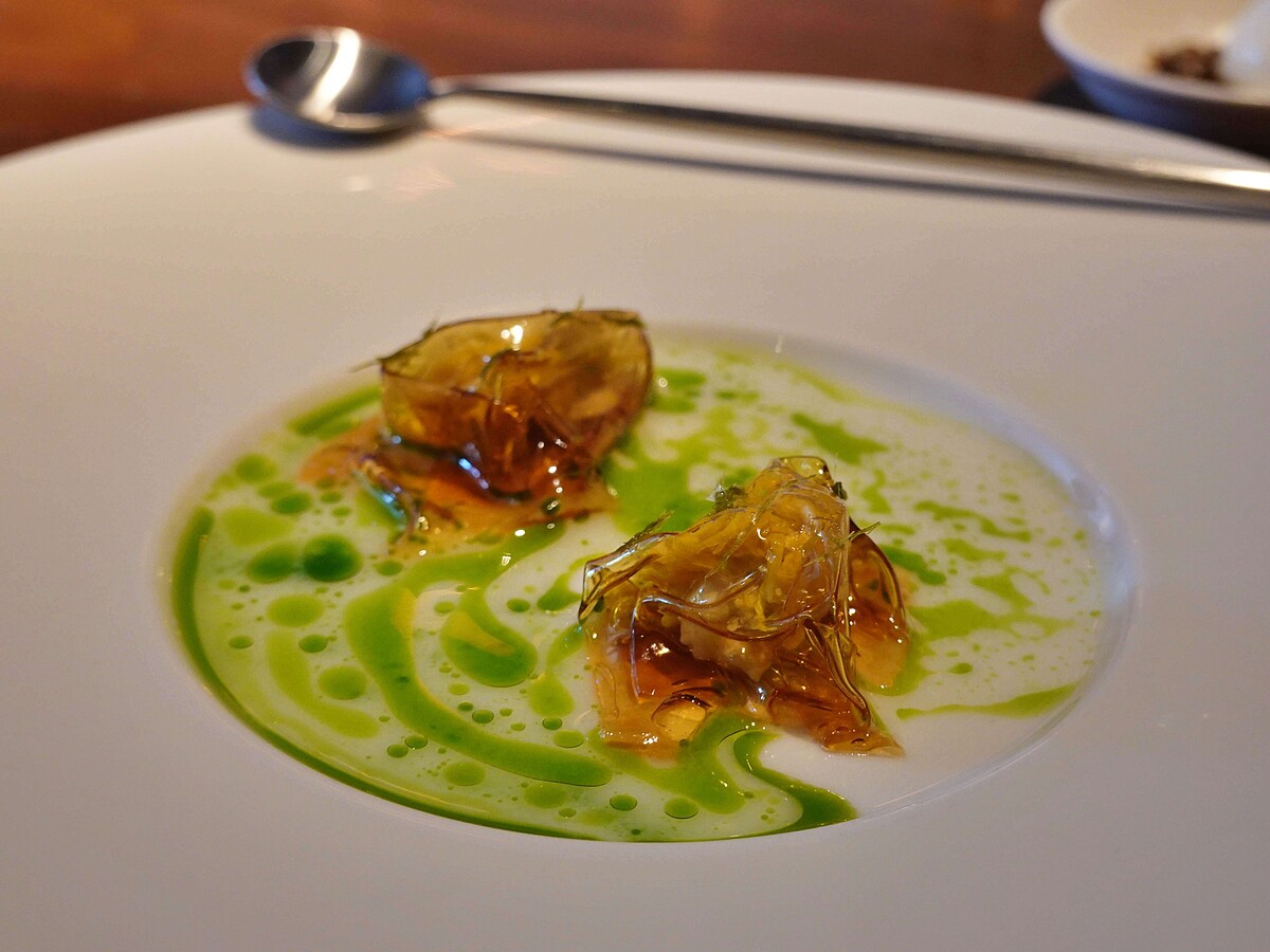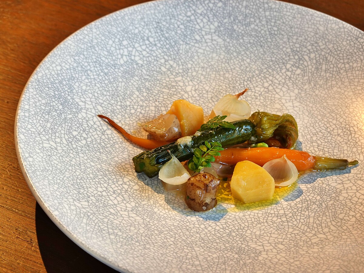 在今年線上視察時 Chef Andre 得知以前青森縣的津輕地區,只有富裕人家才買得起糖,所以蔬菜料理的調味偏甜,比壽喜燒還還甜,甚至可以稱之為「甜品」。而當地貧困人家則只負擔得起根莖蔬菜為主的料理,並以鹽巴調味。然而在日本經濟起飛後,糖開始普及,於是「甘煮什蔬」漸漸成為家常料理。主廚江振誠便認為有點類似台灣的蜜地瓜,與法國的白酒奶油醬燉菜,因而將小胡蘿蔔、花南瓜、菊芋、醃漬小洋蔥等一起燉煮,最後在底下鋪上川燙的鴨肝,驚喜帶出質樸鄉土蔬菜溫潤的多層次口感。
