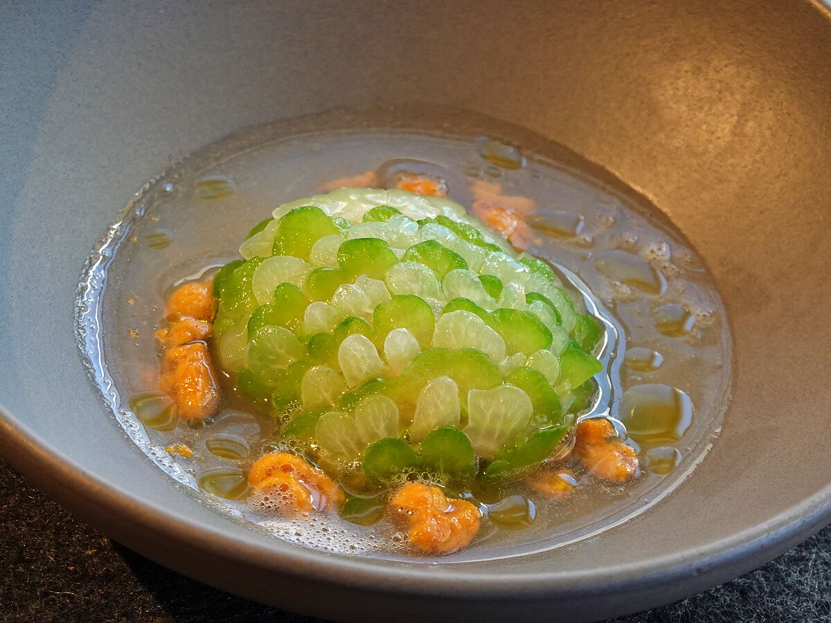 Chef Andre 分享他第一次在青森縣南部地方吃到「草莓煮」時,嚇了一跳,「因為當地的海膽和干貝是唾手可得的食材,一碗草莓煮就加了三分之一盒的海膽,令人大呼過癮地品嘗到超級濃郁又奢華的海味。」並笑說青森的草莓煮裡頭可是沒有草莓的,而是因為當地燙煮過後的海膽,很像日本野生的黃色草莓,所以才用海膽、干貝加進昆布高湯製成一碗海鮮清湯;這便讓他想起台灣同樣充滿海味的苦瓜排骨蛤蜊湯,因此結合兩地著名湯品,由日本沒有的蛤蜊對應海膽,加上台灣料理常用的蛤蜊來提鮮,再用昆布湯加海膽、干貝提鮮,在一片片層層疊上的綠白苦瓜片下,吃盡豪邁回甘的海陸滋味。