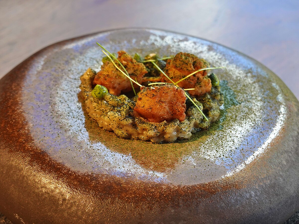 「在豐饒物產的青森津輕,當地媽媽們會將花枝和透抽完整部位,做成刺身和握壽司;頭尾的鬚鬚和三角形部位,則會切丁,加上蔬菜,製成炸花枝餅,再加一點胡椒鹽作調味,就是當地著名的平價鄉土美食。」Chef Andre 如此說,這和台灣的炸花枝丸非常相似,是兩地共同的「食材零浪費」實踐。「因此我延續當地先民的精神,用一般少用的鮑魚肝、鮑魚唇和米飯一起煮成燉飯,最後灑上昆布粉提鮮。」搭配燉飯上的花枝丸一起吃,每一口都滿溢嚼勁鮮味的豐富。