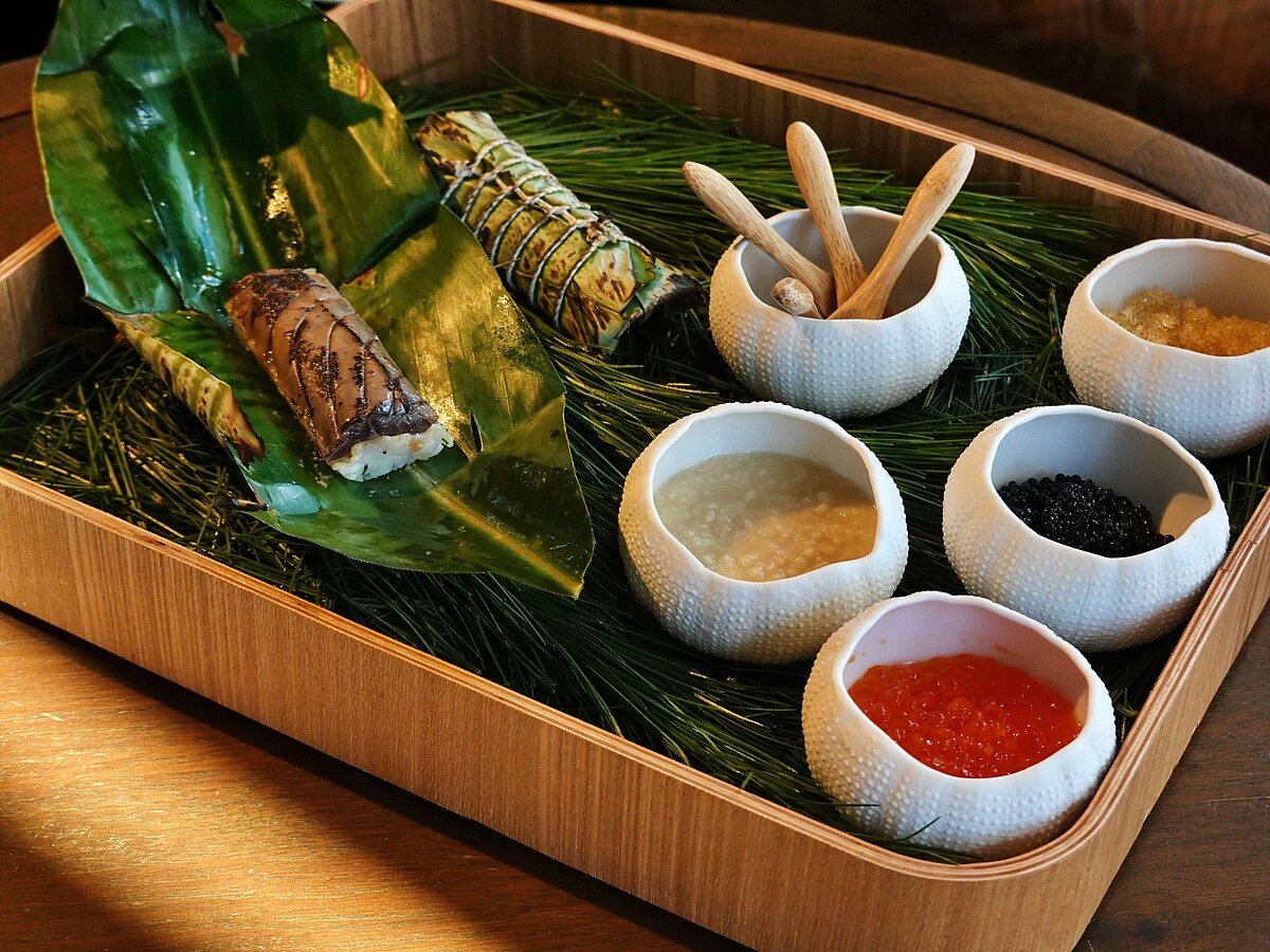 早期青森縣輕津地區會把鯡魚日曬煙燻泡在醋裡頭儲存再做成壽司,和蘭嶼達悟族的飛魚干作法極為相似,加上鯡魚壽司的作法也和原住民傳統的「阿粨」雷同,主廚江振誠因此發展RAW自己的原民阿粨料理,以月桃葉酸漿葉包裹著煙燻飛魚和醋飯,一起火烤完成;再打開帶有煙燻香味的月桃葉後,抹上鹽麴,放上日本鮭魚卵、法國魚子醬和達悟族的飛魚卵,即融合出一道「台日法」混血料理的特殊風味,如同用味蕾遊覽了各地。