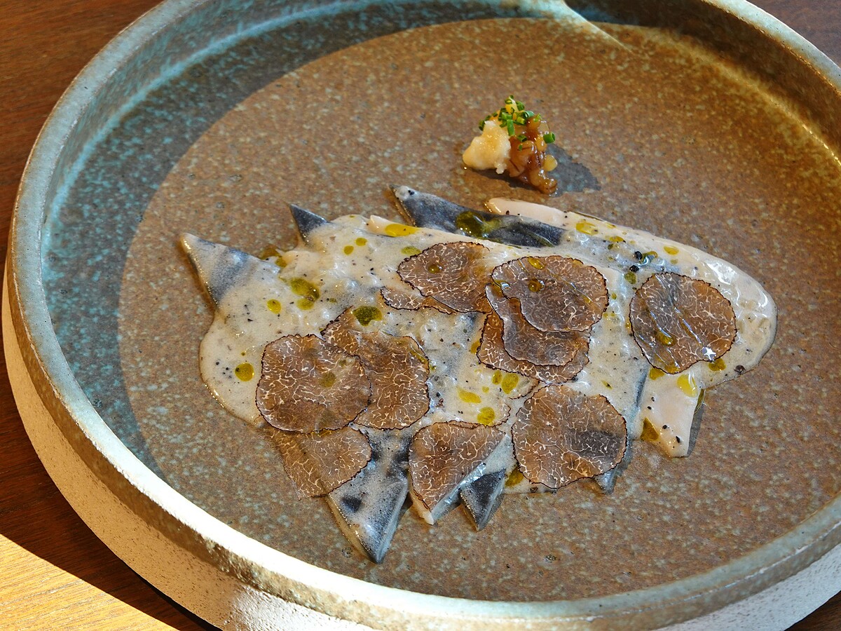 在日本古代製麵師傅會把蕎麥麵糰製成麵條賣給富人和藩主,再將去掉的邊角切成三角型,來自己留著吃或便宜賣給平民百姓,而一般人即會搭配家家戶戶自己獨門的味噌,於是「三角蕎麥麵」漸漸變成青森縣南部地區的傳統美食小吃。Chef Andre 因此聯想在高雄吃到過台南傳統的三角型魚麵,甚覺有異曲同工之妙,故將黑色的青森蕎麥麵、白色的台南三角魚麵,搭配帶有甜味的白味噌金山寺味噌,以及增添風味的蒜泥及黑松露和土魠魚漿,形成濃醇渾厚又豪邁的台式青森吃法。