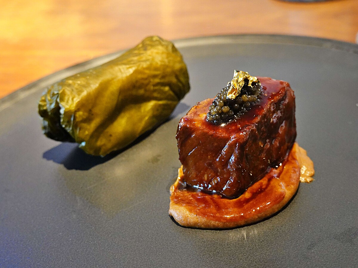 青森縣津輕地區的嫩昆布飯糰,是以稱做「若生昆布」為一年以下的幼小昆布,有著非常柔軟又像豆皮般的薄片,用他們 local 吃法而將昆布包住熱白飯直接食用。而這本身帶有鹹度的昆布,遇熱後會軟化並整個附著在飯糰表面,讓 Chef Andre 看起來就像是台灣刈包,是會配著控肉來吃。他便進而選擇以日本和牛取代豬肉,並以攝氏65度低溫燉煮24小時以上,帶出濃厚的旨味,搭配順著昆布纖維包覆著的米飯橫著切開一起享用這世上獨一無二的「日本和牛昆布刈包」,美妙豐盈的上乘好味,也是 Chef Andre 此次菜單中最愛的一道。