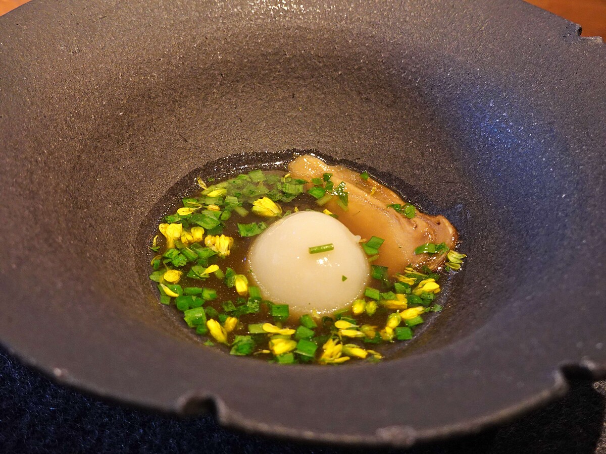 Chef Andre 另也發現在青森有很多有趣的料理名字和實際看到的完全不同,如同「草莓煮」和這道在下北地區盛行的「雞卵」,即「紅豆湯圓」,一般是當地宴會上作為最後的一道甜品,但在青森卻是用鹹湯煮湯圓,因而讓他聯想到台灣「客家鹹湯圓」。RAW便加入日本的油菜花、鴨兒芹,並以少許的韭菜取代一般會加的茼蒿,更另外特別用了當季的日本松茸取代香菇,讓湯頭更顯得順口鮮甜,手工紅豆湯圓搭配著熱湯一起食用的甜鹹雙重享受,絕對是冬天最溫暖的味道。