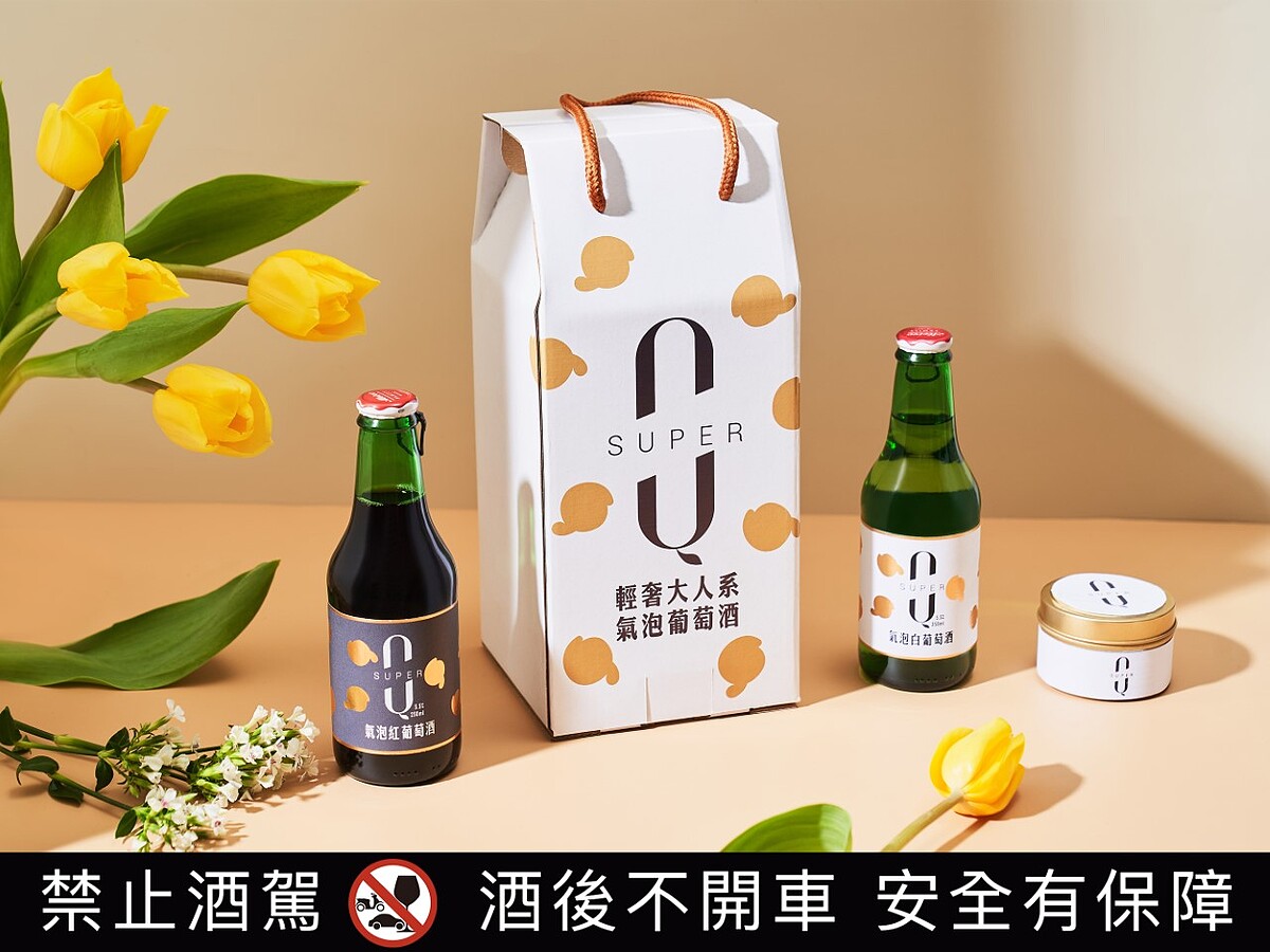 這次推出的「限量白金香氛微醺禮盒組」是台灣限定,包含兩款SUPER Q紅白氣泡葡萄酒,以及清新綠葉花香蠟燭,派對聚餐端出這組絕對沒錯啦!