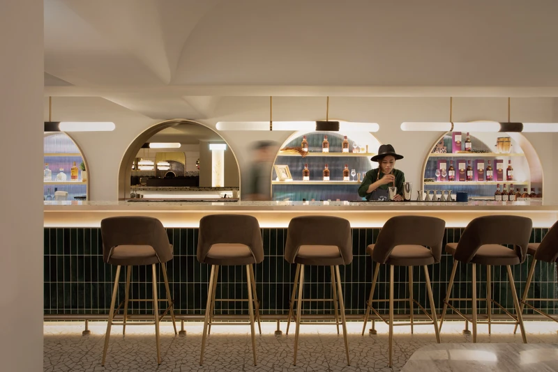 而店內裝潢也別具巧思,運用曲線設計呼應了迴台的流線設計,搭配階段性燈光層次堆疊打造時髦的用餐空間。