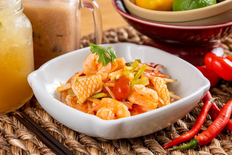 中卷搭配大蝦仁及洋蔥、芹菜、小蕃茄等蔬菜,涼拌出酸甜鮮辣的清爽好滋味,也是瓦城菜色中超開味的神作。M編身邊有「飲食控制中」的朋友,每次都指定要吃這道健康又美味的沙律。