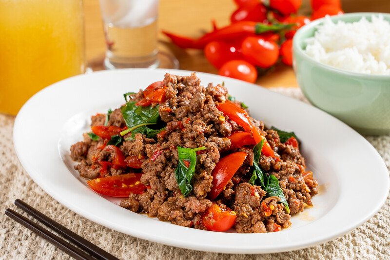 柔嫩的雞腿肉塊與馬鈴薯,用泰國黃咖哩一起燉煮入味。這道能享受泰式咖哩香氣與雞腿肉口感的名菜,鮮甜甘美、鹹甜恰到好處,同樣也好~下~飯!