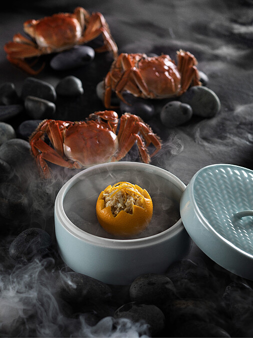 在宋代以前食蟹佐橙已是風潮,橙黃與正肥的蟹紫相映,彼時已知使用酸中帶甜的滋味平衡蟹的膏滿黃飽,蟹釀橙這品經典功夫菜,盛行於南宋時期的秋冬時節,蟹肉利用蒸籠蒸製保留原汁,取下蟹肉與蟹黃、蟹膏拌與橙汁相伴香炒取其鍋氣,透過花雕趨緩蟹肉涼氣,揮發後保留酒氣醇香,與橙肉、橙汁共同去腥提鮮,蟹香、果香、酒香,三者交融,清甜醇美;做工繁複需提前一天預定。