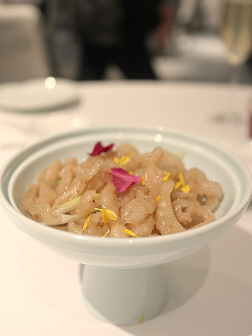 「鮓(注音:ㄓㄚˇ)」為過去保存肉類、海鮮的方式,以調味料醃漬延長食用時間,主廚揀選富含膠質的魚肚、花膠切為細絲,以醋浸泡,食用前與香料、草果調味,入口帶著醋香與發酵後的酸香,並可嚐出海鮮的清甜,相當開胃。
