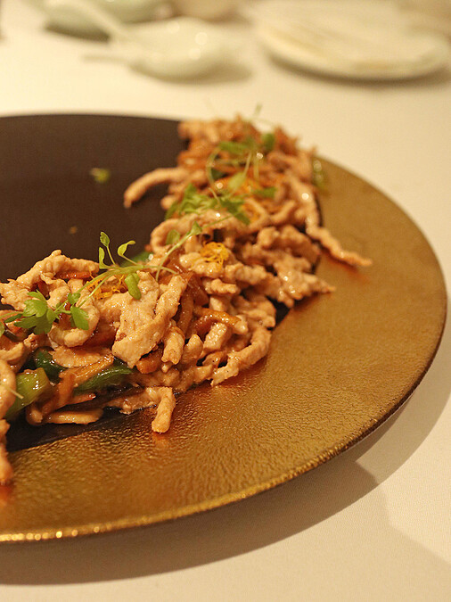 出自《中饋錄》,為宋朝紀載民間家常食譜,「中饋」在南宋為主婦之意,肉生法類似現今醬瓜炒肉絲,傳統作法是將豬肉切為細絲與鹹香醬瓜炒製,主廚特以改良以紅麴醃漬豬里肌肉絲,再與江浙料理中不可或缺的大頭菜拌炒,令外加入陳皮絲,十分鹹甘下飯。