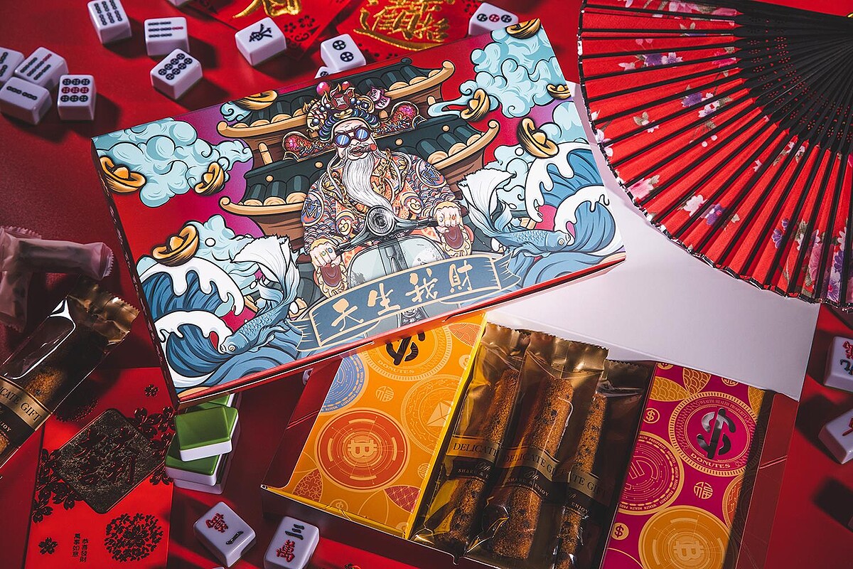 以時髦奢華風格呈現,從外盒到包裝的設計上融入了四款國際貨幣與虛擬貨幣,從比特、以太、美金到歐元通通有!而外盒設計還有小亮點,以流動波浪伴隨亮彩呈現出財富如流水滾滾而來的意象!