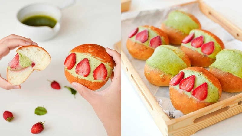抹茶粉快吃!高雄人氣美食《奧瑪烘焙》攜手《辻利茶舗》推出爆餡「抹茶草莓羅馬生乳包」