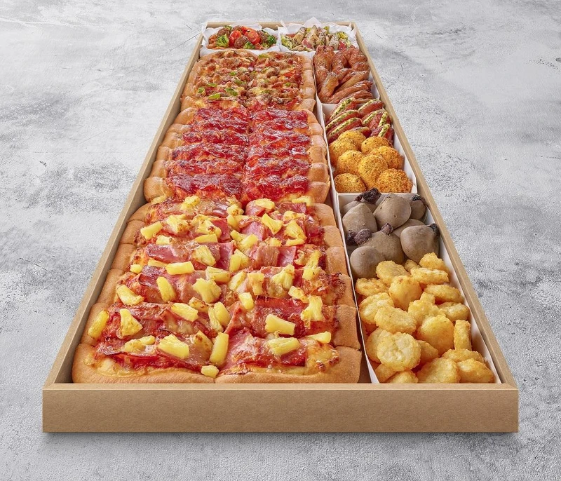 這款「一公尺派對巨飽盒」比薩包含3款口味任選的經典大比薩,還可選擇兩款必勝客獨家封烤技術料理的「紙包筆管麵」,以及5樣必勝客的高人氣熱烤副食,包括「BBQ烤雞」、「薯金幣」、「德國芝心腸」、「麻糬QQ球」、「黃金和風鱈魚塊」。
