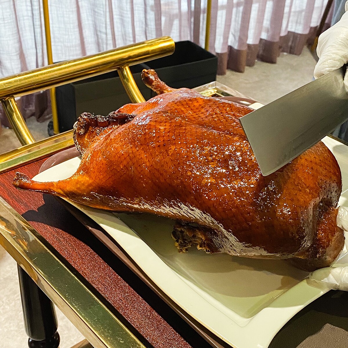 包廂限定「片皮鴨」嚴選3-4個月約5斤的宜蘭櫻桃鴨!使用獨家秘方並遵循古法倒立式歷經三日醃製而成。打造出外酥內嫩的口感,帶點粉色的鮮美肉質。