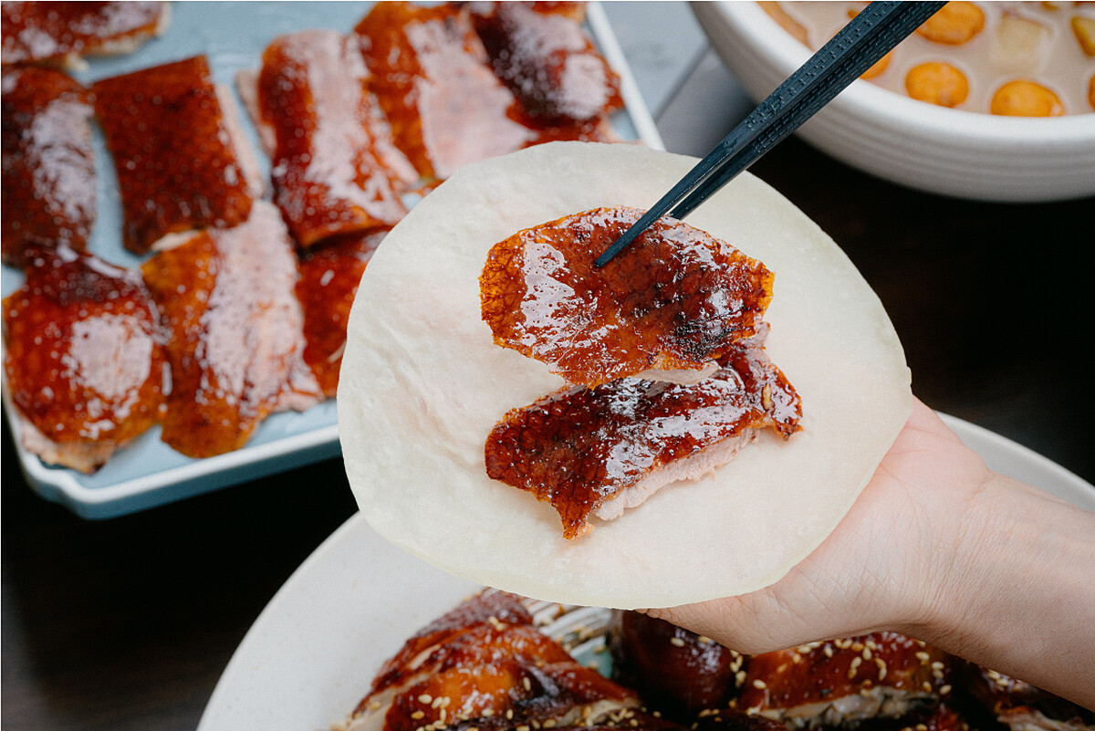 包廂限定主廚桌邊片鴨,一刀下去「咔滋」酥脆的聲音伴隨香氣,讓人口水直流!油亮鴨皮無論是沾白糖感受油脂甜蜜滋味,或是跟柔嫩鴨肉一同包進餅皮搭配宜蘭三星蔥,再淋上特製熬煮甜麵醬,真的很好吃!