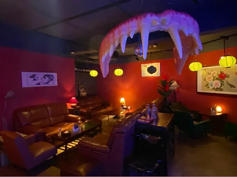 第一間登場的就是它——桂公子酒館!位在一棟大樓的地下一樓,大樓入口處就可以看到顯眼的招牌,寫著大大的「桂公子」,這樣的迷幻外觀很難不勾起人們的好奇心,想一探葫蘆裡賣的是什麼藥。店內主要光源來自於霓虹燈以及中國風的傳統燈籠,四處佈滿了幽默標語的春聯,感到詭異的同時又忍不住想噗哧一笑,就是這間酒吧獨樹一幟的風格。