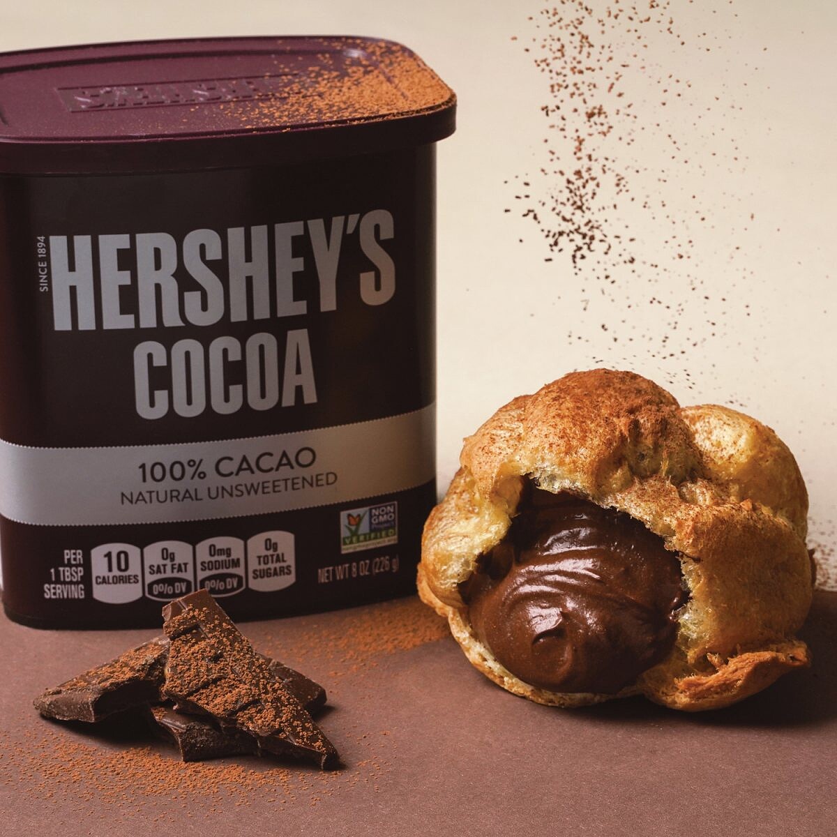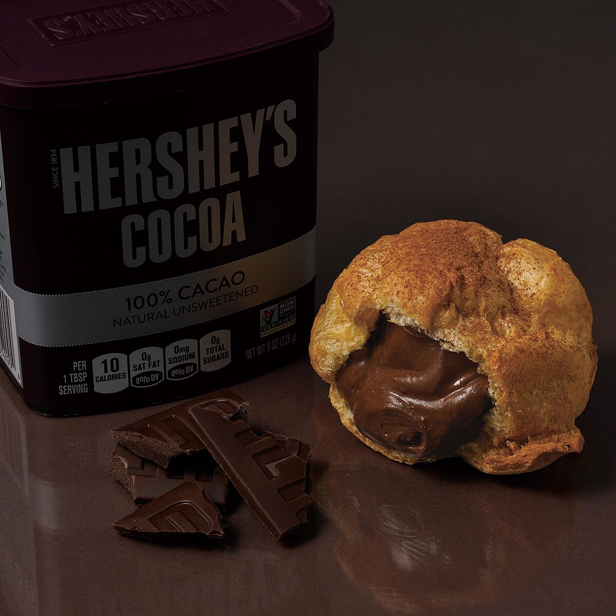 將HERSHEY'S純可可粉拌入招牌香草卡士達內餡,入口感受微苦甜、濃郁滑順的口感,完全是大人系巧克力泡芙,即使不嗜甜的人也能嚐鮮一波,每一口都能品嚐到滿滿HERSHEY'S巧克力內餡,真的太幸福啦!