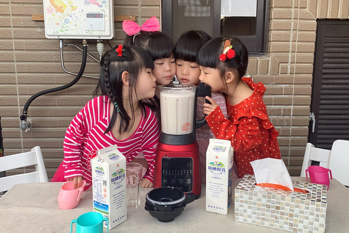若芊、若蒂、若軒、若宸四胞胎在社群上呈現溫馨可愛的一面,天生小小隻的四胞胎也有個頭好壯壯的願望,媽媽也常常提醒四個孩子要多出門玩、多運動、睡飽飽,在飲食上也下足功夫,家中必備調理機現煮芋頭牛奶、紫米芝麻鮮奶、紅豆鮮奶,不時更換口味和食譜,搭配連續五年獲得「世界評鑑大賞金獎」的瑞穗鮮乳,希望讓孩子開心喝下足夠的鈣質!