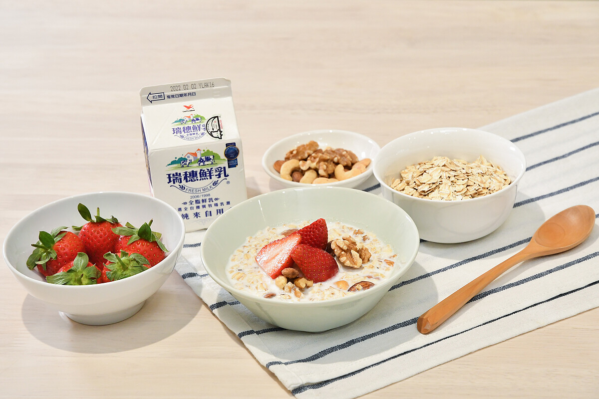 食材:燕麥30g、草莓5顆、無調味堅果20g、瑞穗鮮乳290ml