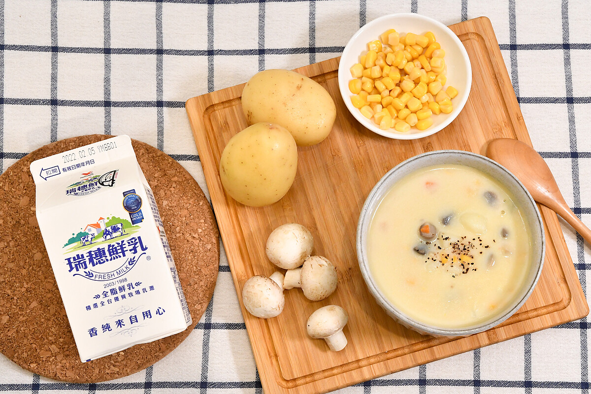 食材:馬鈴薯1顆(小)、蘑菇3朵、玉米粒2湯匙、瑞穗鮮乳400ml
