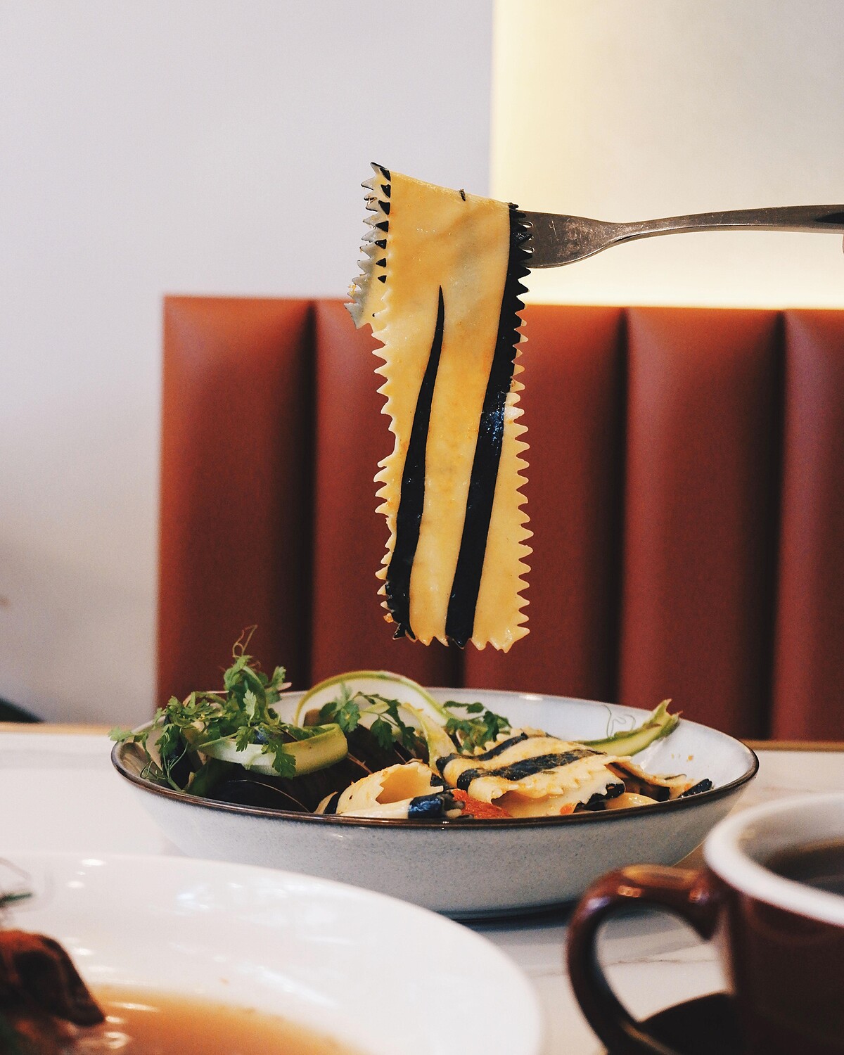 將年節必備的烏魚子浸泡在花雕酒中,蒜片及蛤蠣經過爆香後,再搭配手工特製虎皮麵,最後炒入更增加風味及口感,「烏魚子飛魚卵橄欖油」,讓清炒義麵風味更加濃郁!