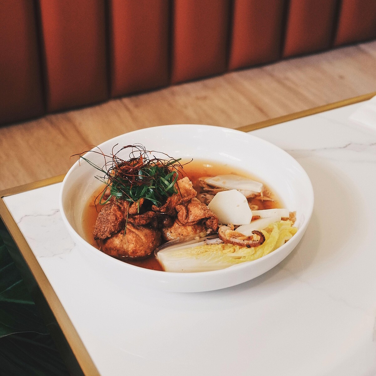 將傳統佛跳牆食材慢燉,發揮巧思加入豬腳、豬耳朵、虎掌凝結成佛跳牆凍,再包入手工義大利麵餃內製作成福袋造型,最後淋上老母雞干貝高湯,是意想不到的中西合併口味,真的太好吃啦!