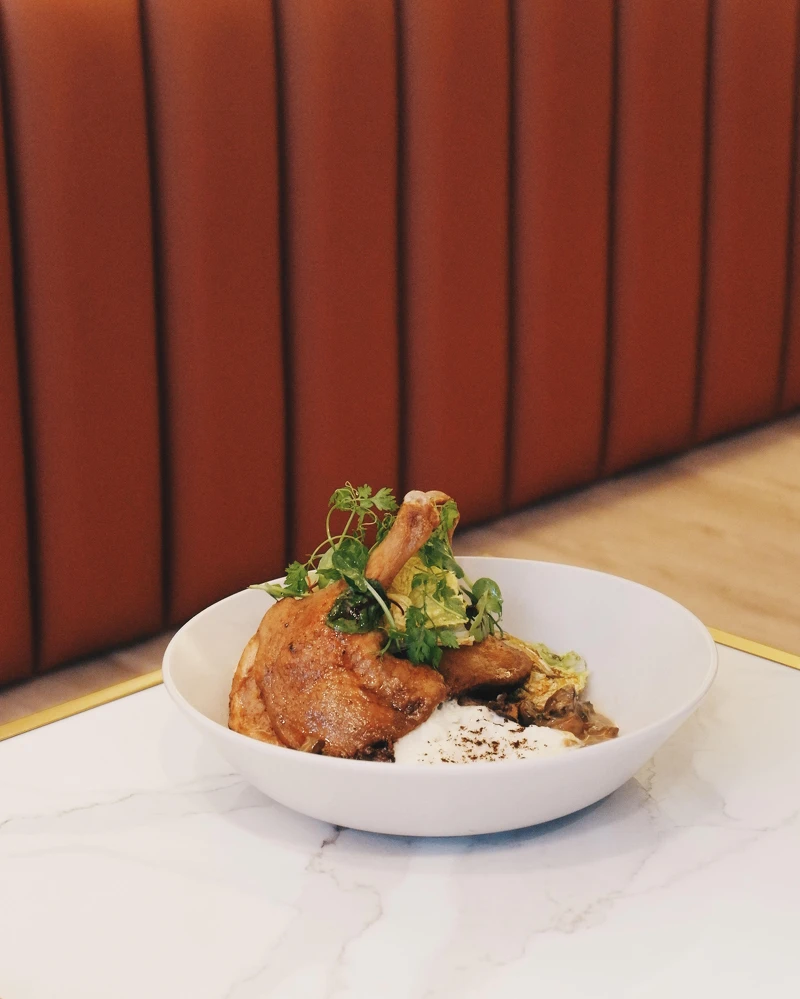 與台北知名咖啡店攜手打造,以低溫烹調舒肥,再將85度萃取咖啡豆的香氣煉成咖啡油,油封鴨腿以數十種香料醃漬 4 小時。而咖啡薯泥、奶油煎烤娃娃菜尾韻帶有焦香風味,更呼應了拿鐵蘑菇醬汁,多層次的風味讓人一吃就驚艷!