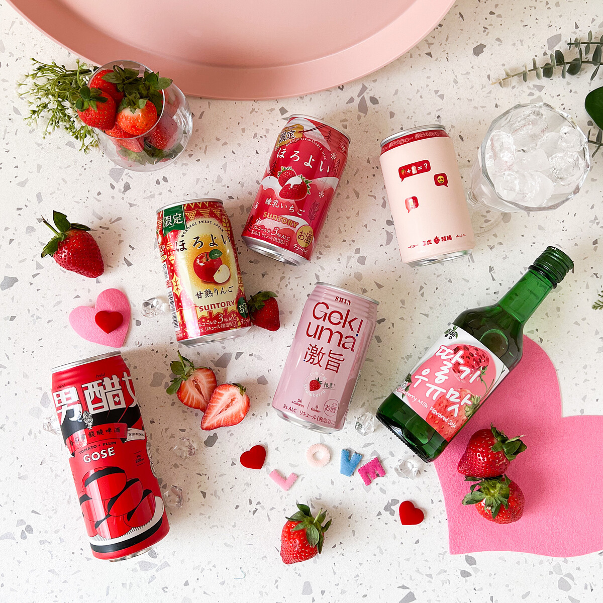 草莓飲品部分則有文青風格包裝的「台東初鹿草莓拿鐵」、使用大湖草莓添加乳酸製作而成的「臺虎精釀朦朧莓沙瓦」、「SUAN草莓紅茶氣泡飲」、「吉藏草莓牛奶風味燒酒」以及「可爾必思草莓乳酸菌飲料」,都是本次季節限定商品。