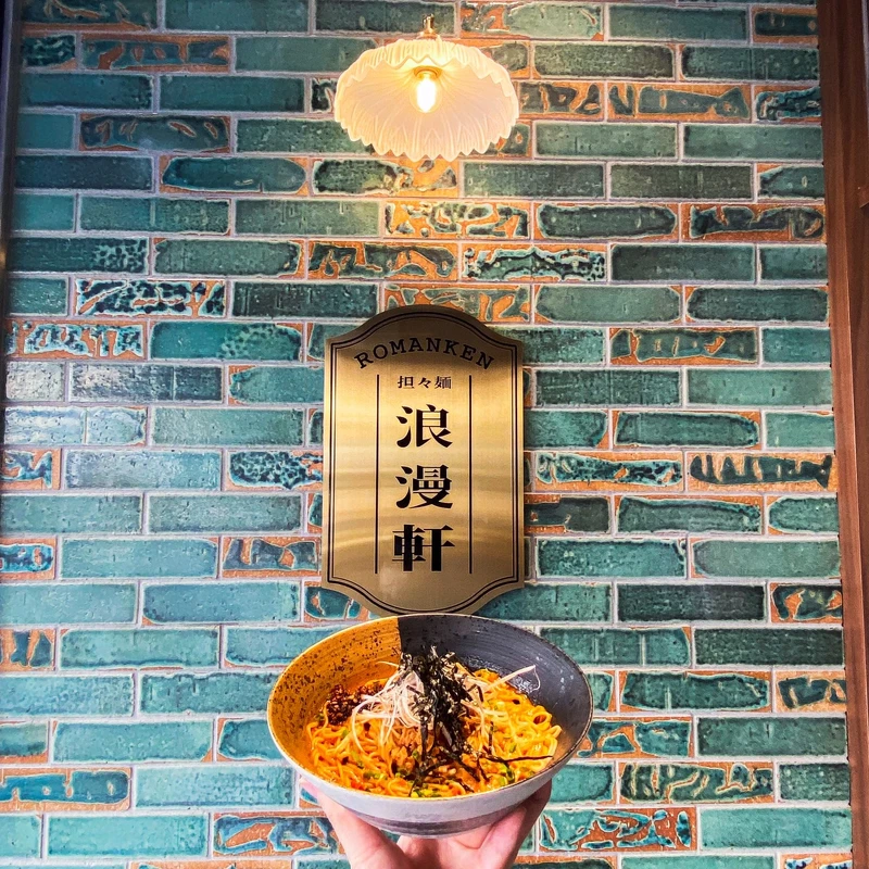 浪漫軒担々麺隱身在四維路的靜巷內,路過就會被浪漫軒的外觀所吸引,以不同深淺的綠磚搭配斑駁磚的牆面,一旁則是木框搭配各式壓花玻璃,非常迷人,讓人有種置身日本巷弄間發現迷人小店的錯覺!