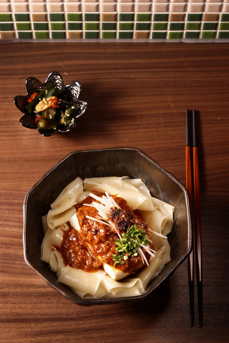 而主角之一的豆腐則顛覆傳統麻婆豆腐呈現方式,特選厚塊有機豆腐浸潤在自家熬煮的大骨湯內,待麵條煮熟起鍋後,加入整塊未切豆腐、澆淋麻婆肉醬、灑花椒粉上桌,豐富香氣襲來誘人食指大動!