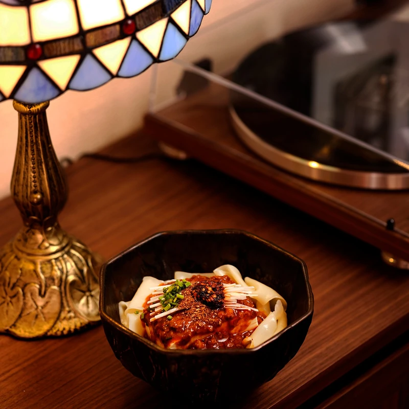 黑膠唱片爵士樂音在空氣中流動,擔擔麵的濃郁芝麻、麻婆豆腐麵的四溢麻香,交織出療癒的溫暖氛圍!