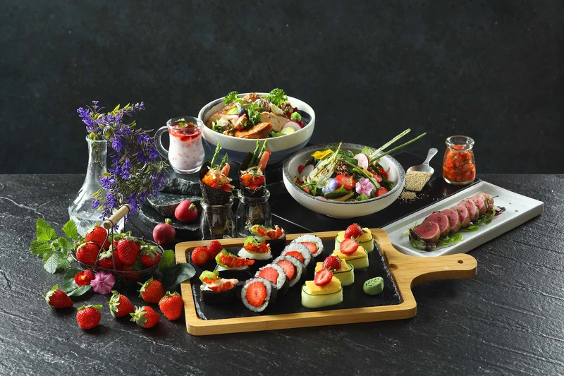 此外,還有去年大受好評的草莓吃到飽「莓好食光」再度回歸!嚴選苗栗大湖鄉網室栽種的草莓,紅艷甜美,香氣濃郁,將新鮮草莓入菜,打造一系列草莓餐點,像是炙燒鰹魚草莓莎莎、草莓乳酪手卷、草莓壽司捲、草莓龍蝦軍艦壽司、草莓玉子燒握壽司…等等。