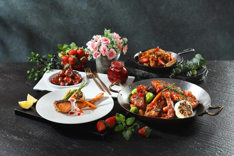 此外,50樓Café的餐點選擇多元,有生猛海鮮吧、現流生魚片、燒烤炸物區、以及爐烤美國牛肉,中西熱食也有用草莓入菜的品項,包括草莓芥末碳烤豬肋排、香煎鮭魚佐草莓莎莎醬、草莓野蔬咖哩、草莓糖醋雞丁、草莓慢燉牛肉丸、和現做草莓楓糖炸雞鬆餅…等,光看圖片就讓人口水直流。